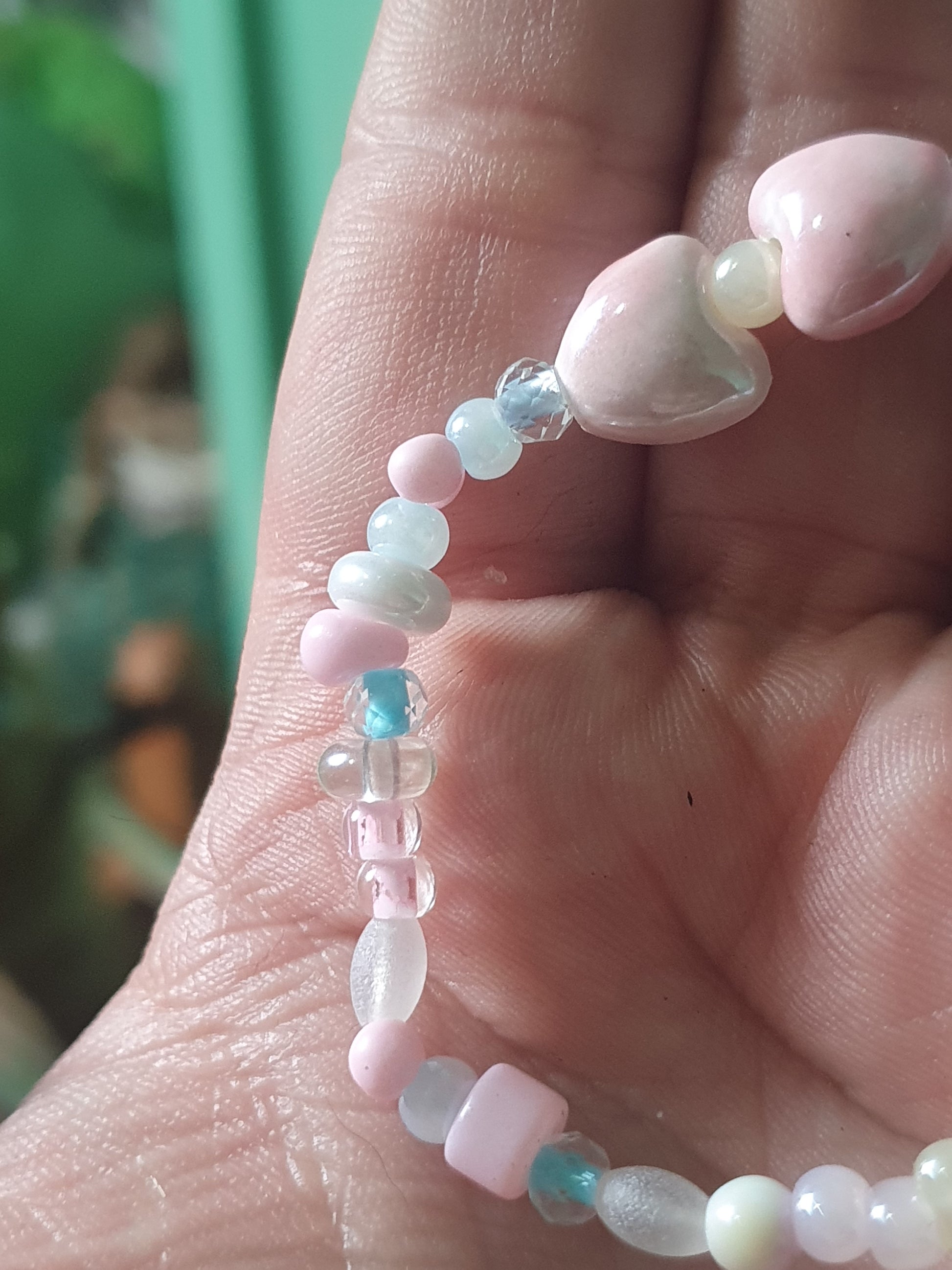 Baby pink, blue, white and green tiny glass beads with ceramic focal beads.