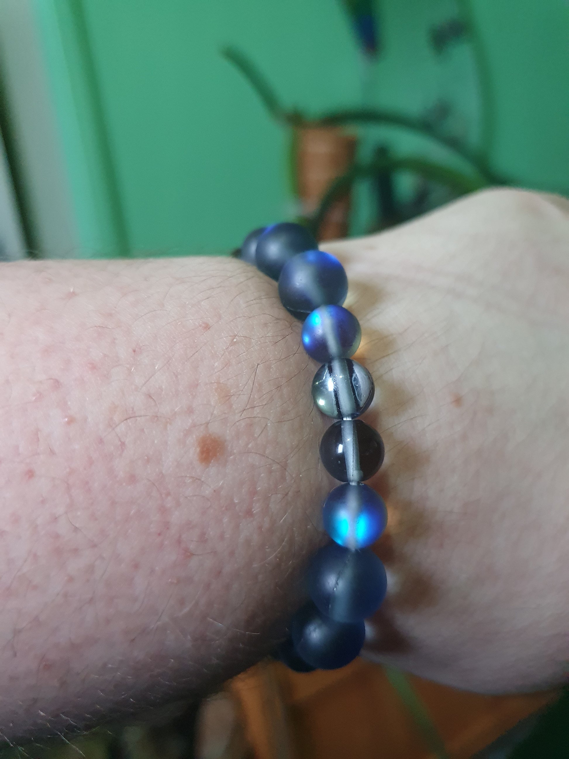 Matte grey beads with blue colour shift, matched with clear grey glass beads.